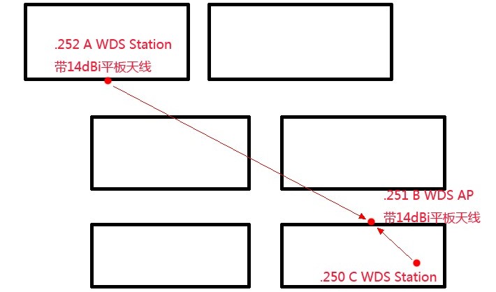 手上已经有三台340G两面14dBi的定向平板天线。以前也尝试过店面和家里无线组网,但是效果一直不理想,数据速率太低、丢包严重、340G的WDS只支持WEP加密,最后也就放弃了。现在使用三台340G(A、B、C)使用WDS Station—-> WDS AP <—- WDS Station的方法桥接,其中B作中继免除拉网线线入屋的麻烦如图。