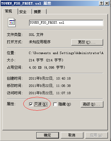 把以下路径下的”YOUKU_FSO_PROXY.sol”删除, 然后打开一个优酷的视频, 此时”YOUKU_FSO_PROXY.sol”将重新生成, 最后把新生成的文件属性改成只读。